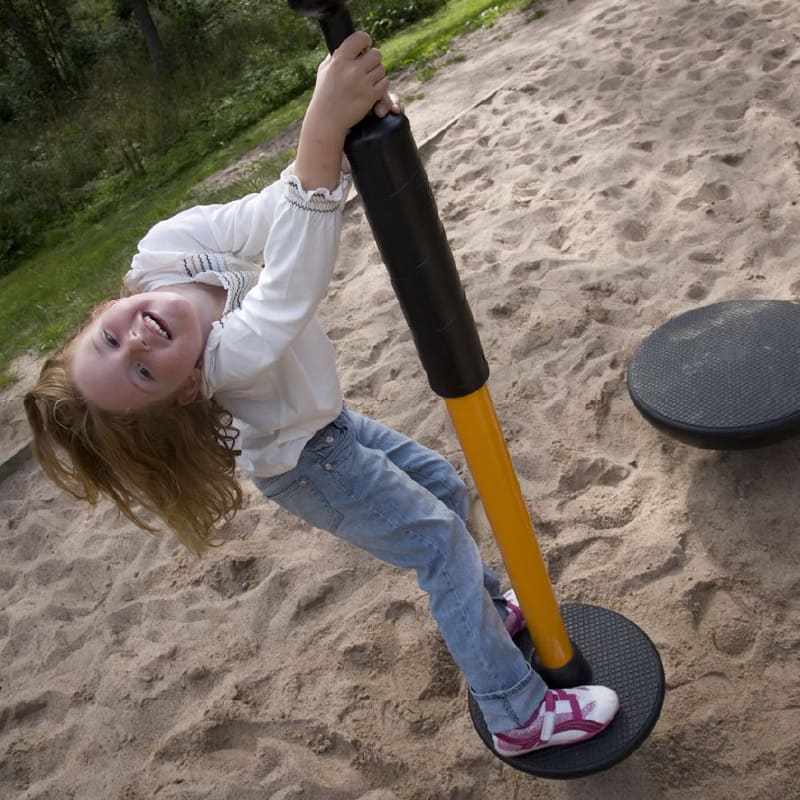 棒と踏み台が軸を中心に回転します。身体を動かすことで遠心力がつき、地面に足をつけることなくダンスをしたり、ジャンプしたり、身体をねじったりすることができます。 遊び環境作りに必要な要素の「めまい・陶酔性」の一時的に知覚を麻痺させる遊びを体験することができます。