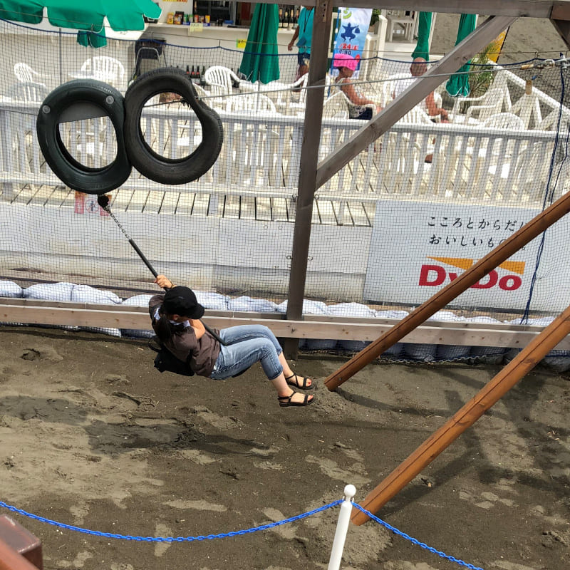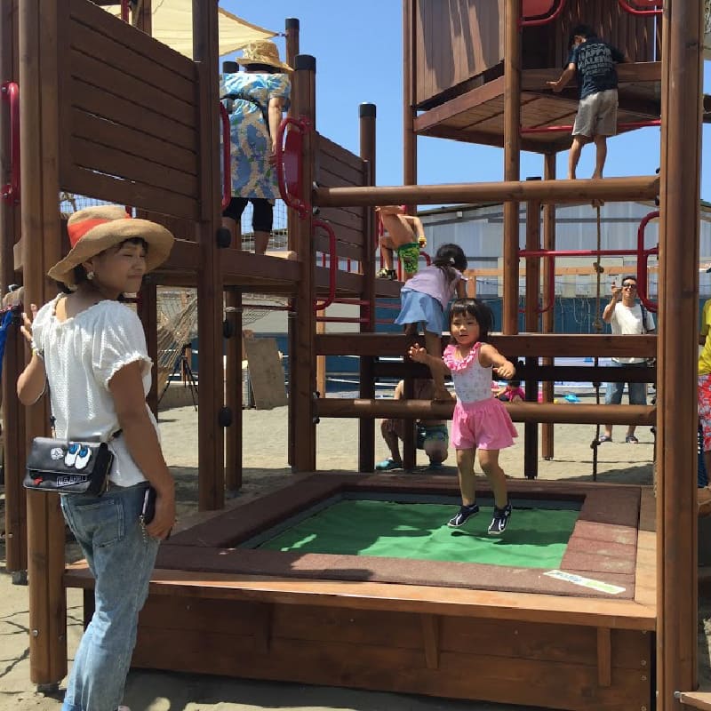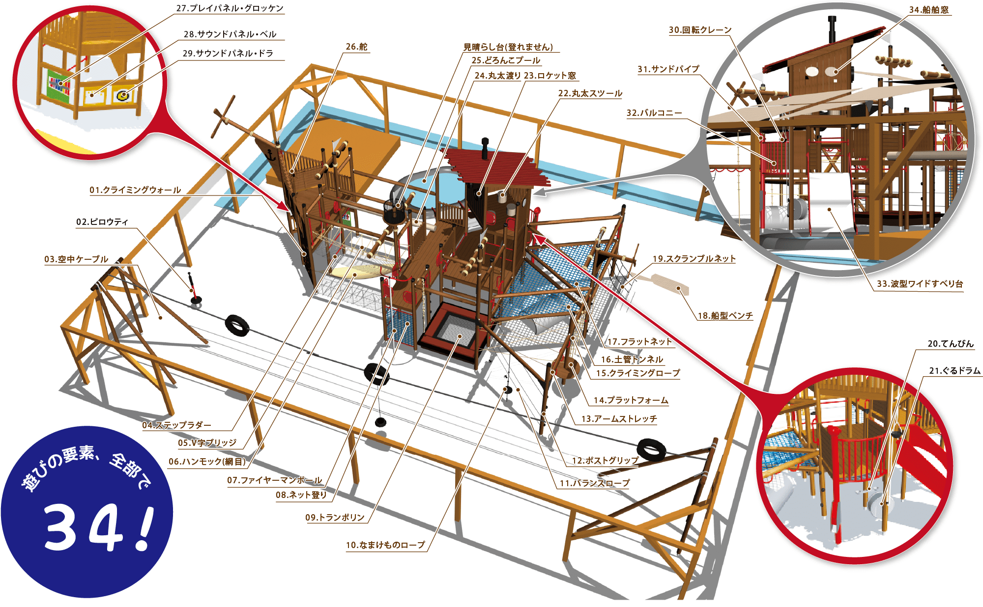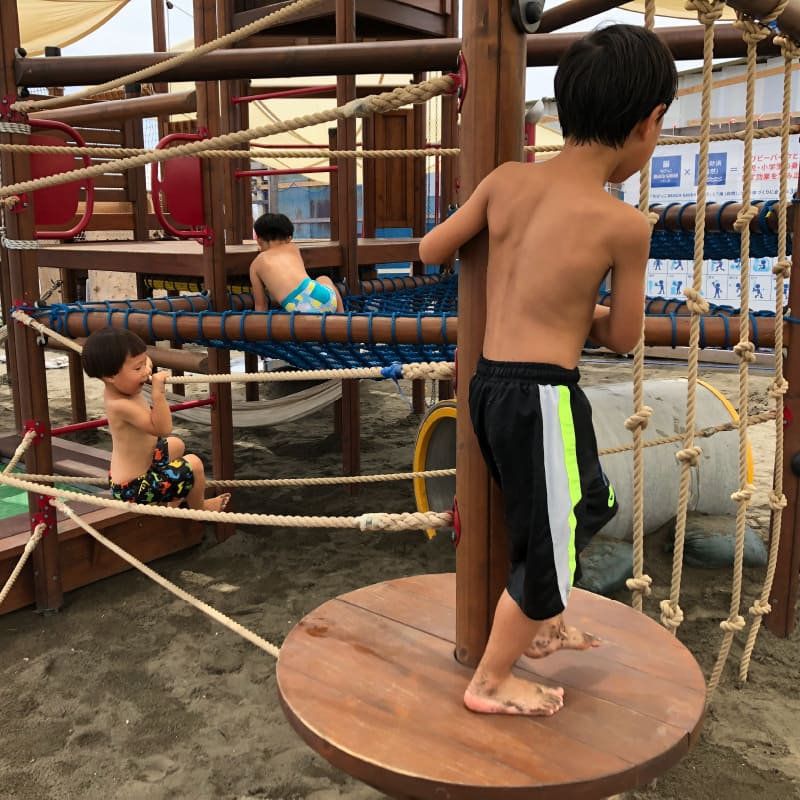 ロープ途中の円盤の上で座って揺れたり、一休みしたり、回ったり、足がかりにして上に登ったりといろいろな遊び方を発見できます。