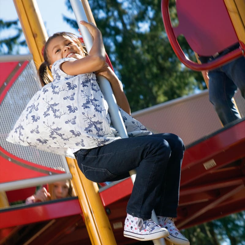 勇気を出して消防士のようにポールに飛びつき、滑り降りる遊びです。 着地の衝撃への慣れとバランス感覚を身につけることができます。
