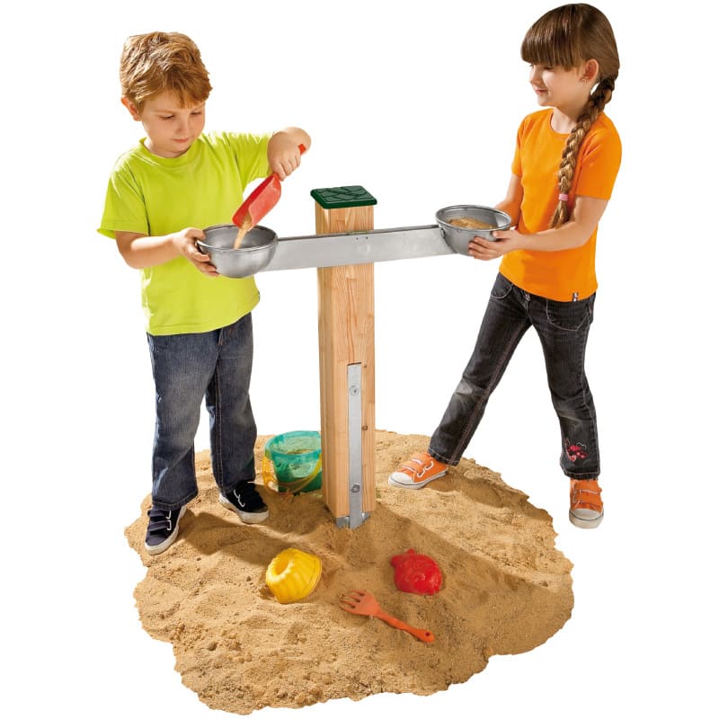 天秤に砂や水を入れて、重さを量ったり同じ分量に揃えたりできます。中央には水平を測る装置(レベル)も付いていて本格的です。
