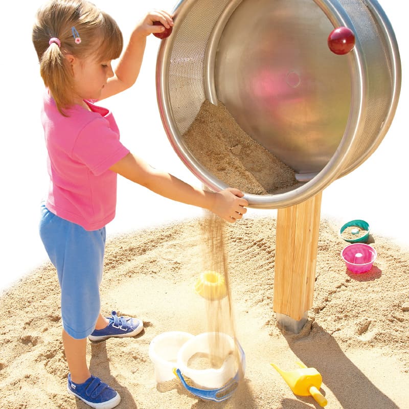 工場?焼きいも屋さん?子ども達の大好きなぐるぐる回す遊びです。ドラムは斜めに傾いていて、中に砂を入れて回すと少しずつ砂がこぼれてきます。