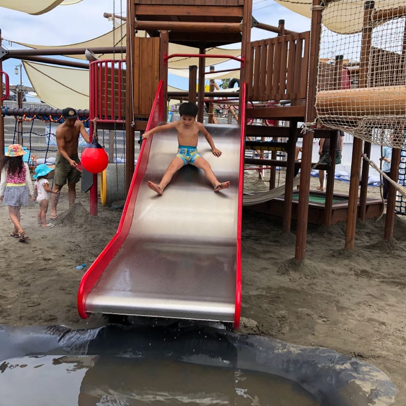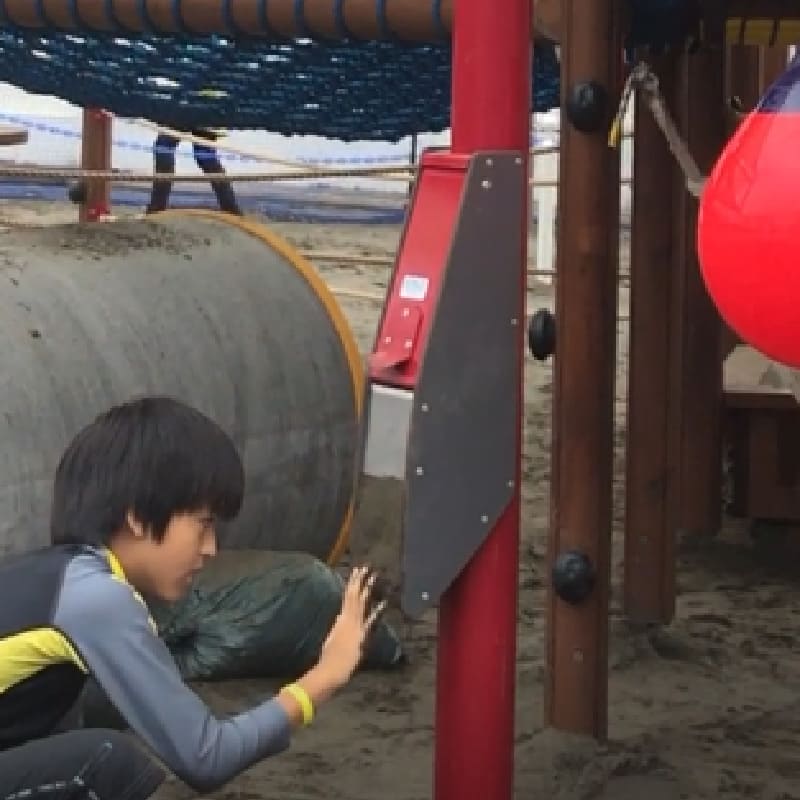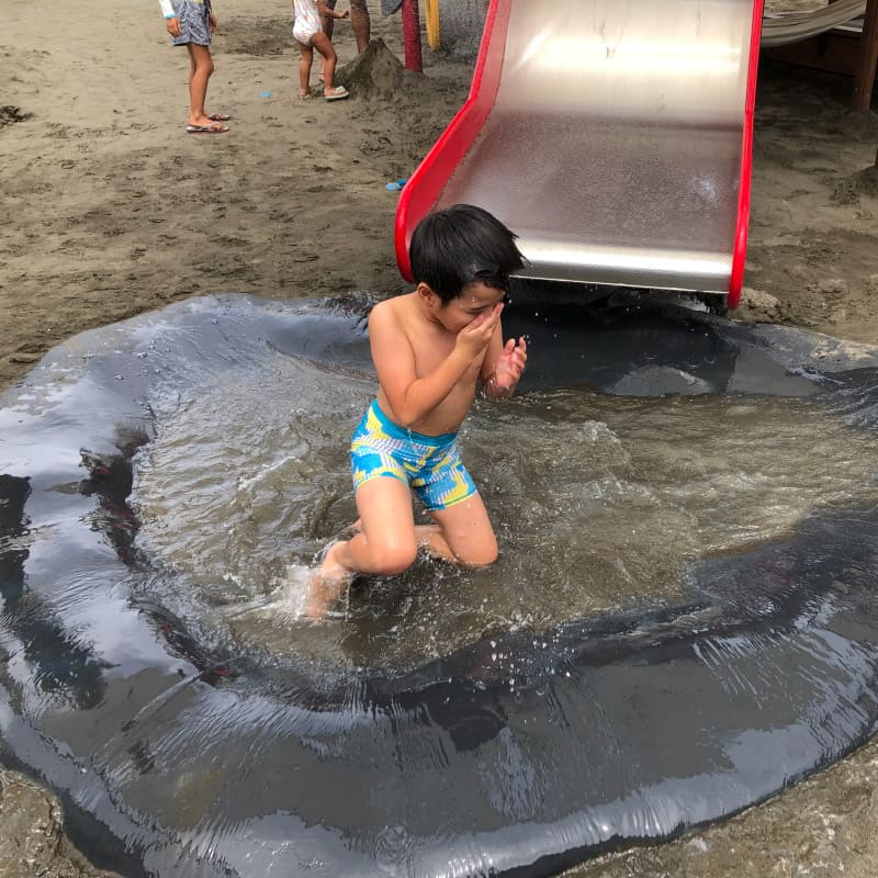 すべり台の着地地点にあるどろんこプールは、落下の衝撃を緩和するだけでなく、 ずぶ濡れになることで、汚れることに対する抵抗感を和らげ、いろいろな遊び方へのチャレンジ欲を促します。